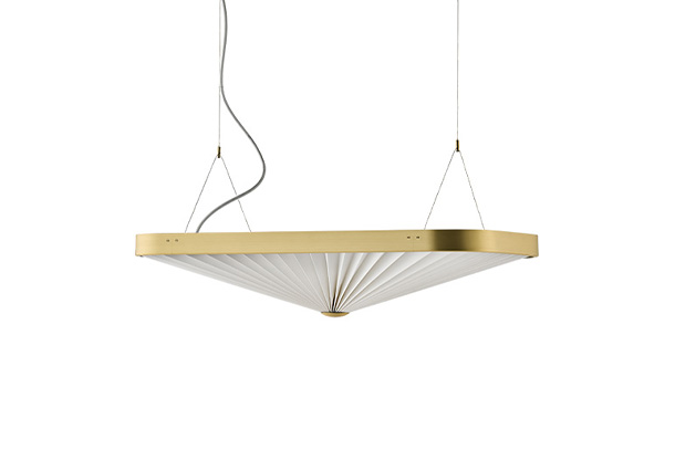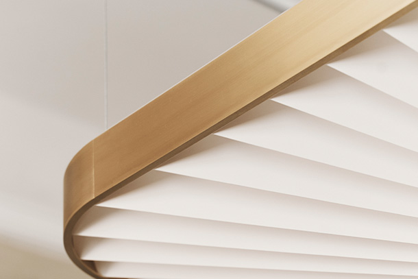 形状は、デザインミュージアムの建築にみられるすっきりとしたライン、大胆な曲線にインスパイアされ、非常にシンプルでクリーンな外観です。無垢の真鍮で作られたフレーム、その形状に沿って折られたレ・クリントの代名詞であるプリーツのシェードから構成されています。
