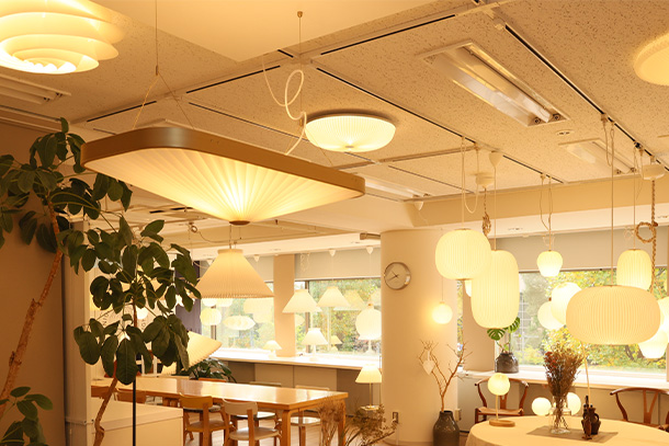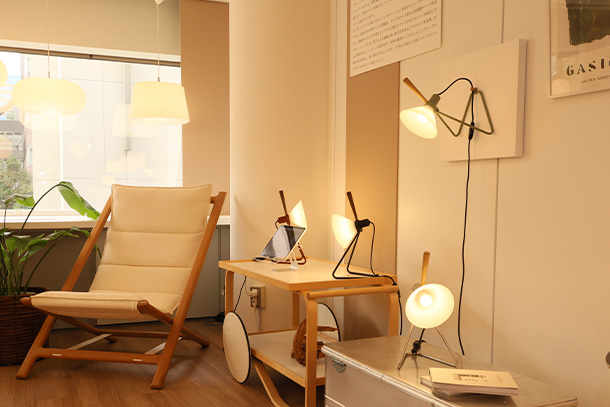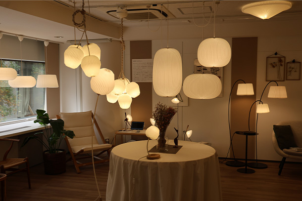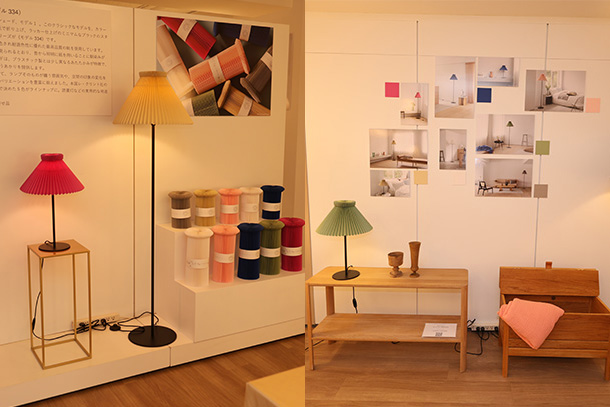 また、日本でこの秋販売を開始したアイテムも集結。コペンハーゲンのデザインミュージアム・デンマークのためにデザインされ、施設やオフィス空間などに最適な直結タイプの美しいペンダントライト「セリーヌ」をはじめ、7色のバリエーションを揃えたペーパーシェードシェードが目をひく「フロアランプ/テーブルランプ モデル334」などを展示しました。