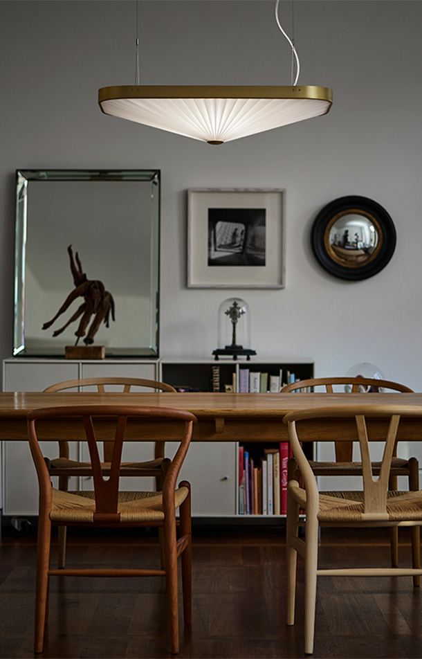 無垢の真鍮で作られたフレームと、その形状に沿って折られたレ・クリントの代名詞であるプリーツのシェードから構成されたペンダントライト。数々の受賞歴を誇るOEO Studioによって、コペンハーゲンにあるデザインミュージアム・デンマークとレ・クリントとの歴史的な関係に敬意を表してデザインされました。スペースプランニングをともなう、施設や店舗、オフィス、住空間などに最適です。