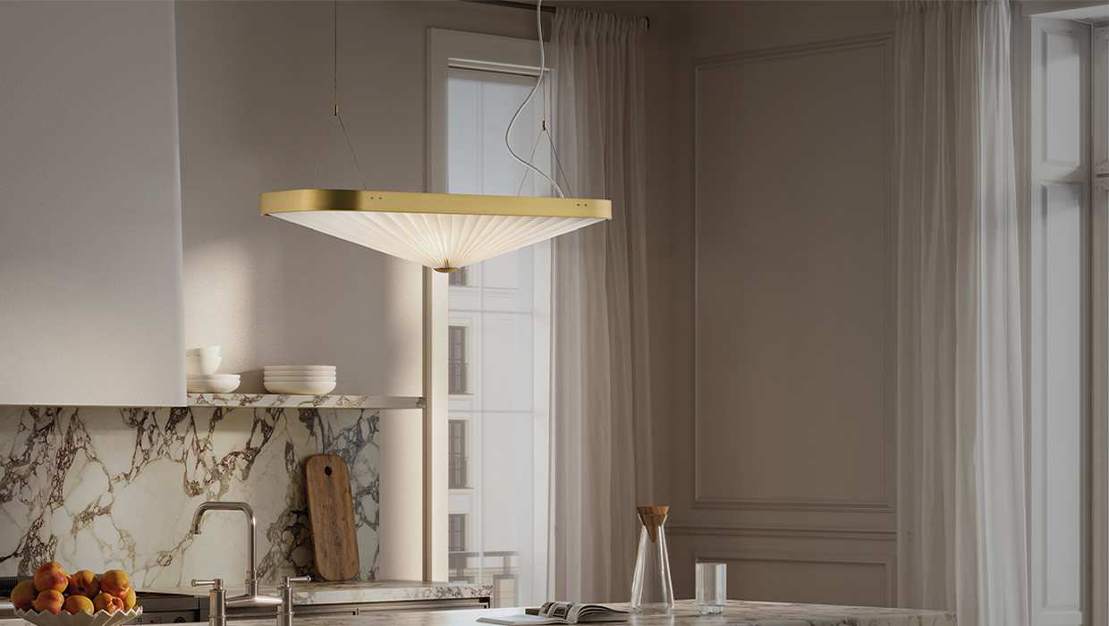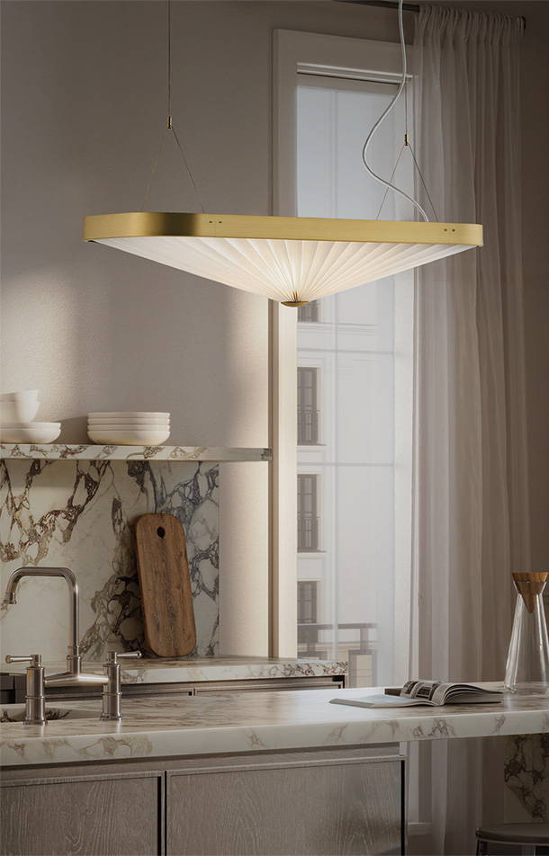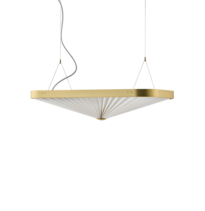 無垢の真鍮で作られたフレームと、その形状に沿って折られたレ・クリントの代名詞であるプリーツのシェードから構成されたペンダントライト。数々の受賞歴を誇り、日本との関わりも深いOEO Studioによって、コペンハーゲンにあるデザインミュージアム・デンマークとレ・クリントとの歴史的な関係に敬意を表してデザインされました。スペースプランニングをともなう、施設や店舗、オフィス、住空間などに最適です。